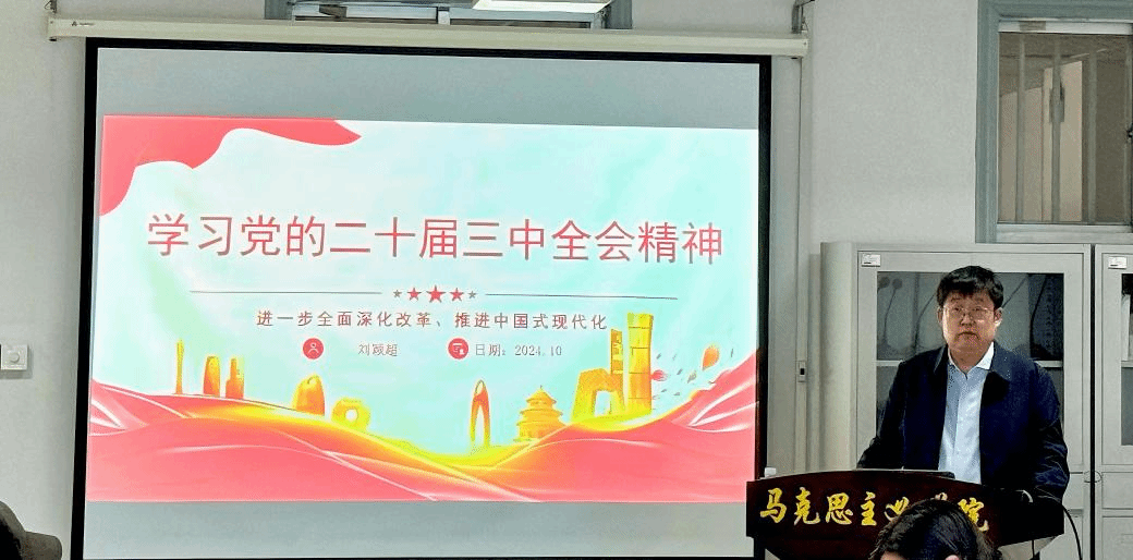 党委书记刘颖超在学院小会议室以“学习党的二十届三中全会精神”为题作宣讲报告,马克思主义学院党委理论学习中心组成员以及学生代表聆听了此次报告。