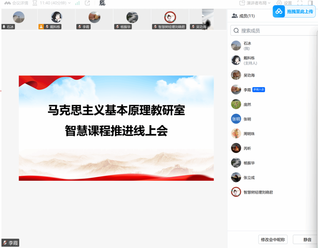 原理教研室全体教师、智慧树课程建设工作人员通过腾讯会议召开“马克思主义基本原理”智慧课程建设专题推进会。会议由教研室主任石冰主持,原理教研部全体教师参会。 会议首先传达了学院关于智慧课程建设的总体要求,围绕“马克思主义基本原理”智慧课程建设的核心目标,系统解读了智慧课程建设的重点内容与阶段时间安排。明确了“章节体系优化、视频资源建设、互动设计创新、考核机制完善”四大建设方向及各阶段时间节点。