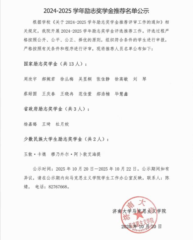 2024-2025学年励志奖学金推荐名单公示